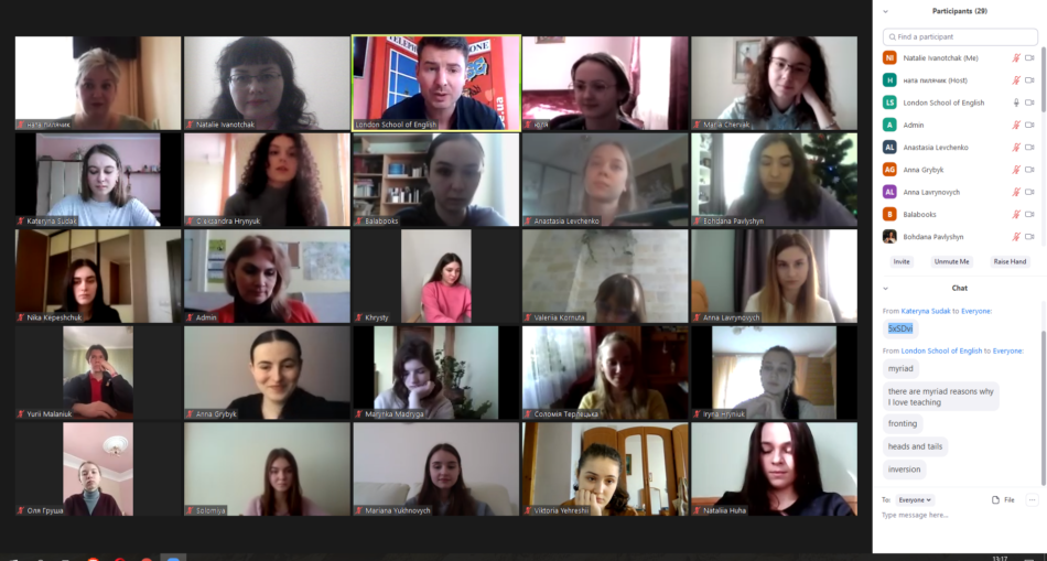 Завдяки співпраці з нашими іноземними партнерами: міжнародним освітнім центром Dinternal Education та London School of English факультет іноземних мов має змогу залучати до занять провідних методистів-практиків. Нещодавно студенти освітньої програми «Англійська мова та література (переклад включно)” груп А-21а та А-35з (викладачі к.ф.н., доц. Наталія Пилячик та к.ф.н., доц. Наталія Іванотчак) поспілкувалися з директором школи London School of English, сертифікованим викладачем англійської мови Cambridge CELTA та Cambridge DELTA, екзаменатором міжнародних іспитів Pearson Test of English, Томом Бартоном.