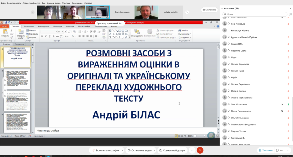 Доцент Андрій Білас виступив з доповіддю “Розмовні засоби з вираженням оцінки в оригіналі та українському перекладі художнього тексту”. Присутні обговорили стан перекладознавства в Україні та виклики сучасних термінологічних підходів.