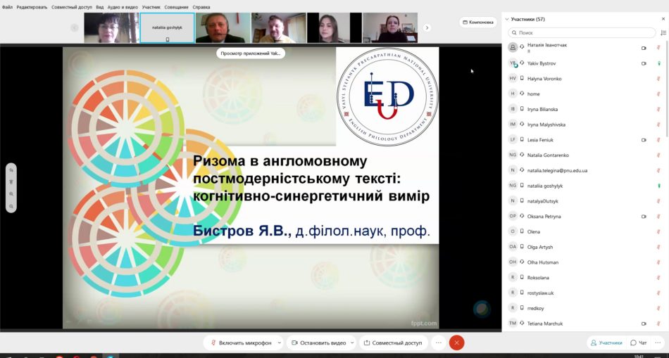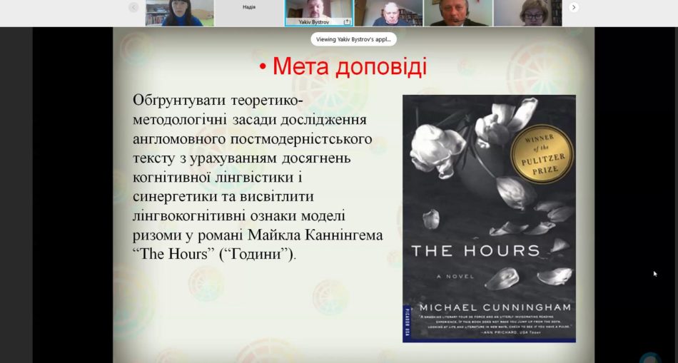 Жваву дискусію викликала доповідь проф. Якова Бистрова “Ризома в англомовному постмодерністському тексті: когнітивно-синергетичний вимір” про теоретико-методологічні засади дослідження англомовного постмодерністського тексту з урахуванням досягнень когнітивної лінгвістики і синергетики на матеріалі роману М. Каннінгема “The Hours” (“Години”). Проф. Бистров наголосив, що український переклад цього роману виконала випускниця факультету іноземних мов Оксана Пастранська.