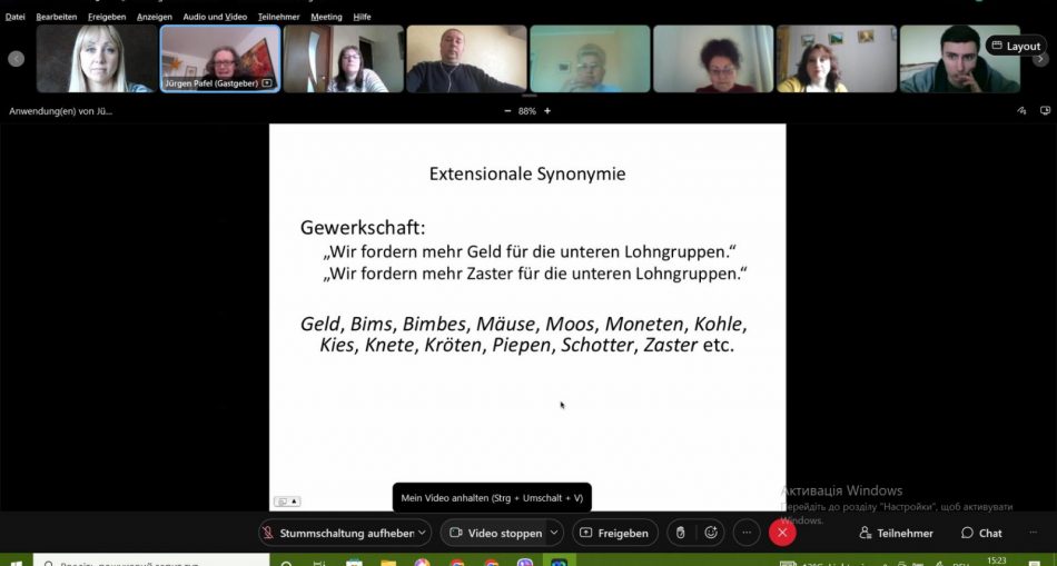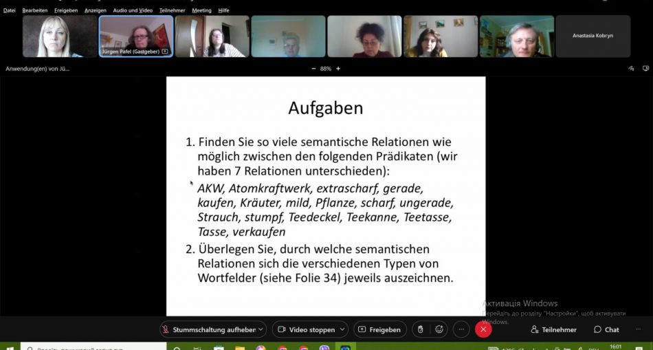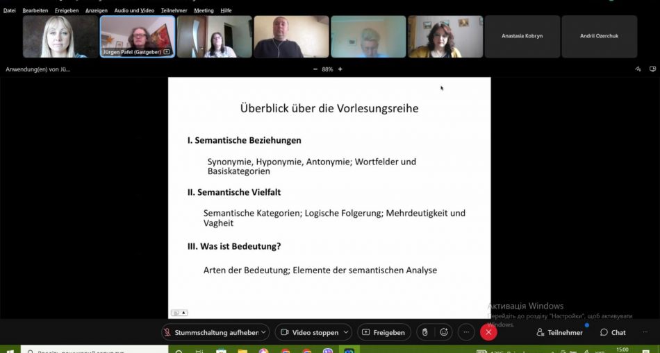 26 квітня 2022 року відбулася перша лекція з питань семантики, яку за ініціативи кафедри німецької філології прочитав професор Інституту лінгвістики та германістики Штутгартського університету Юрген Пафель. Сьогоднішня лекція була присвячена базовим поняттям, основним семантичним зв’язкам та категоріям. В рамках цікавої, логічно структурованої презентації науковець за допомогою простих і яскравих прикладів протлумачив важливі питання семантики, що безперечно, стане в нагоді майбутнім науковцям та усім, хто цікавиться сучасною лінгвістикою. На онлайн-лекції були присутні студенти і викладачі кафедри німецької філології.