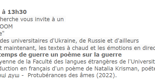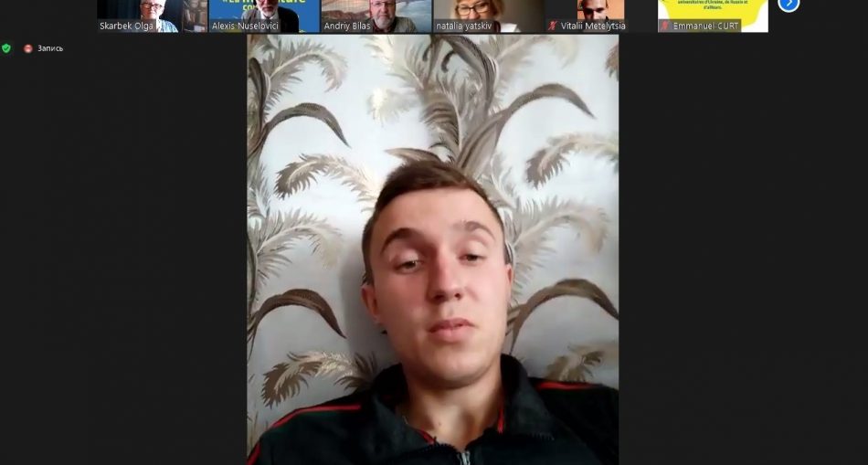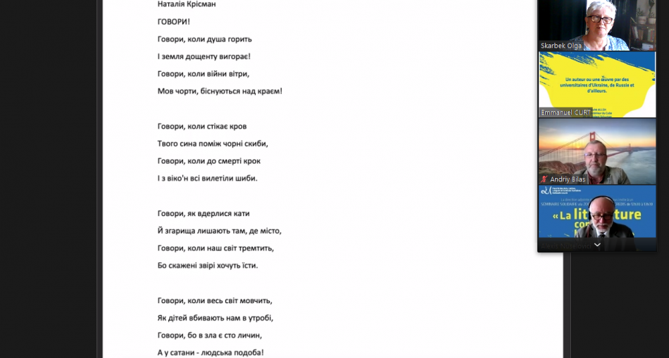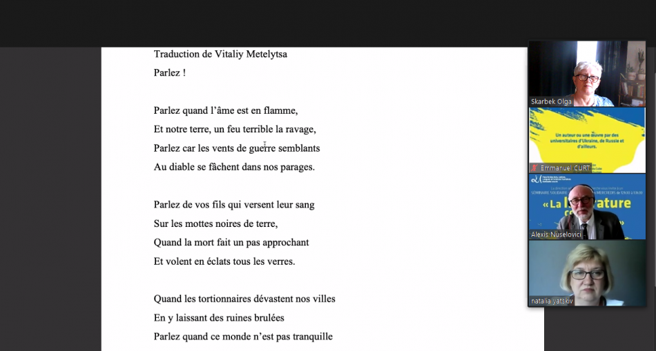 У середу, 18 травня, в рамках солідарності французьких вчених з університетами України, відбувся другий міжнародний семінар«Література проти війни», організований факультетом мистецтв та гуманітарних наук університету Екс-Марсель (Faculté des Arts, Lettres, Langues et Sciences humaines Aix Marseille Université), в якому взяли участь викладачі та студенти кафедри. За ініціативи та за сприянням декана факультету іноземних мов, професора Яцків Наталії Яремівни на обговорення пропонувався вірш львівської поетеси Наталії Крісман «Говори» у перекладі студентів третього курсу Віталія Метелиці та Павла Сорохтея. Наталія Яремівна зробила ґрунтовний аналіз твору, в площині стилістики, лексики та синтаксису. Свої міркування з приводу перекладу висловив доцент кафедри, викладач теорії перекладу Білас Андрій Андрійович. В обговоренні взяла участь і старший викладач Скарбек Ольга Георгіївна. Хотілося б відзначити хорошу роботу наших студентів, чіткі та обґрунтовані відповіді на запитання організатора.