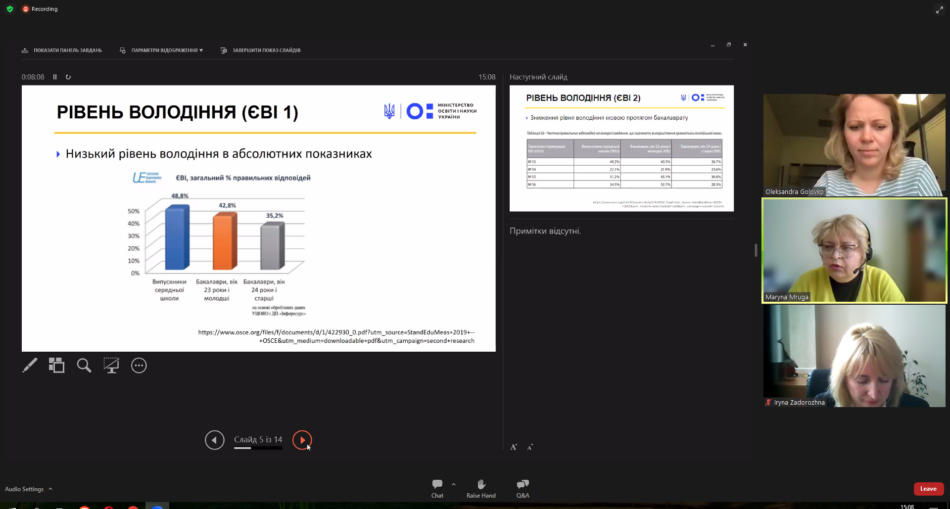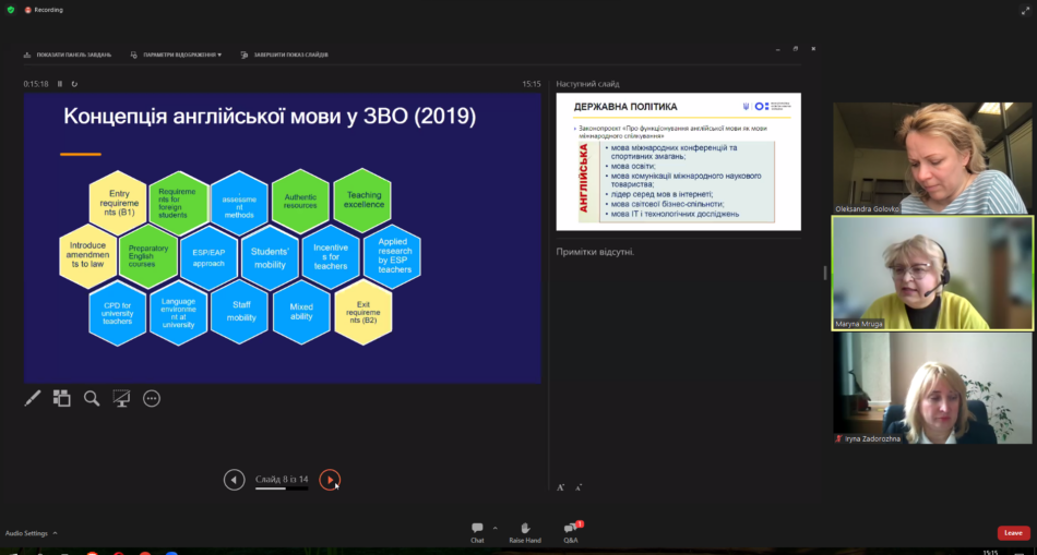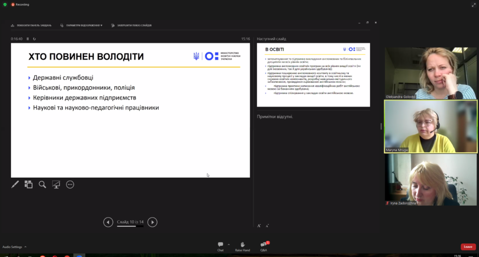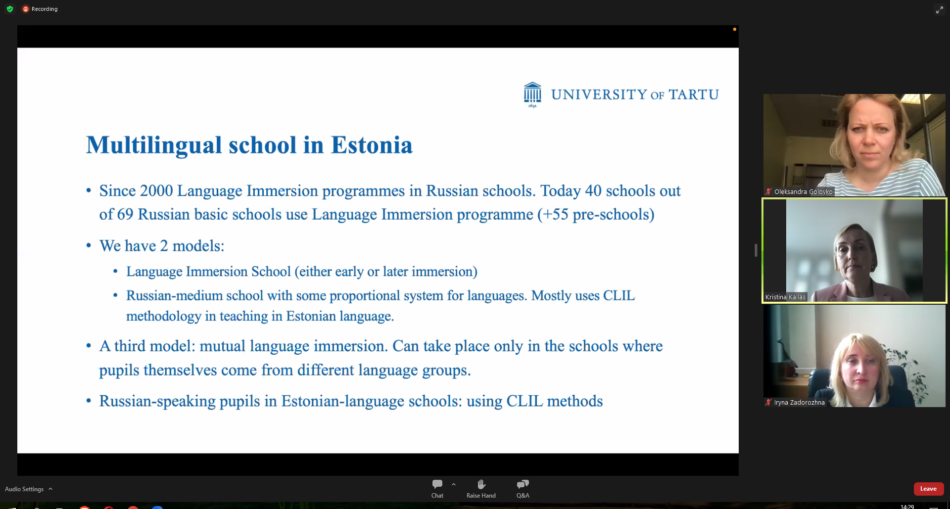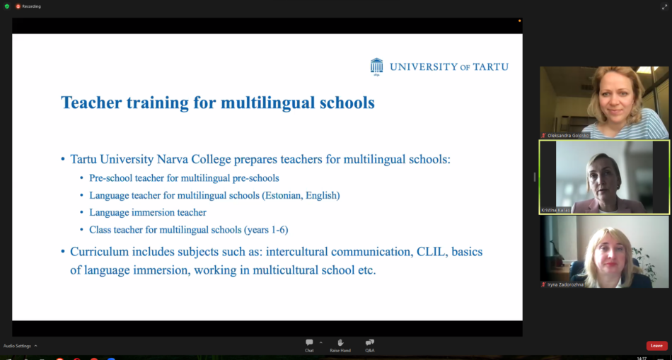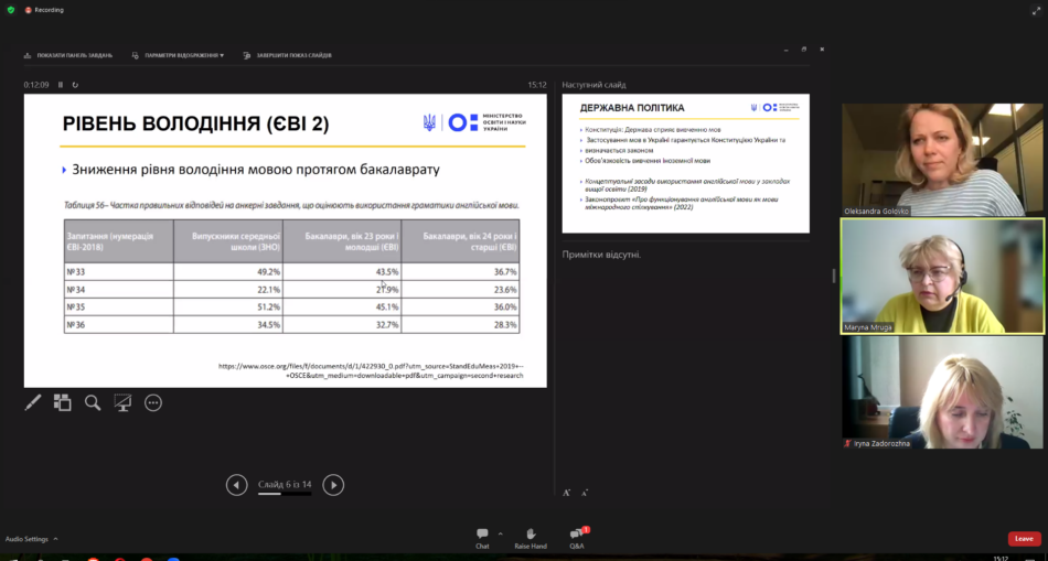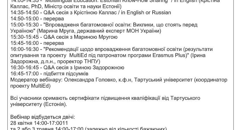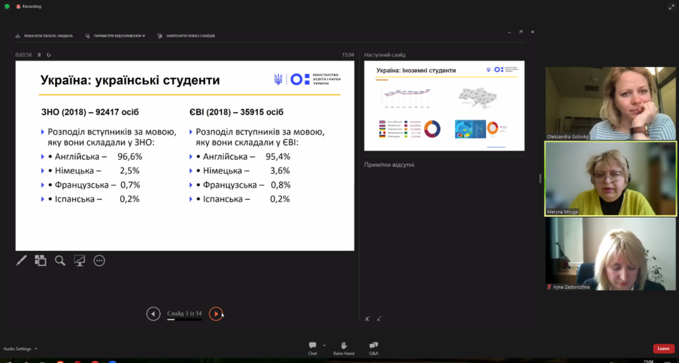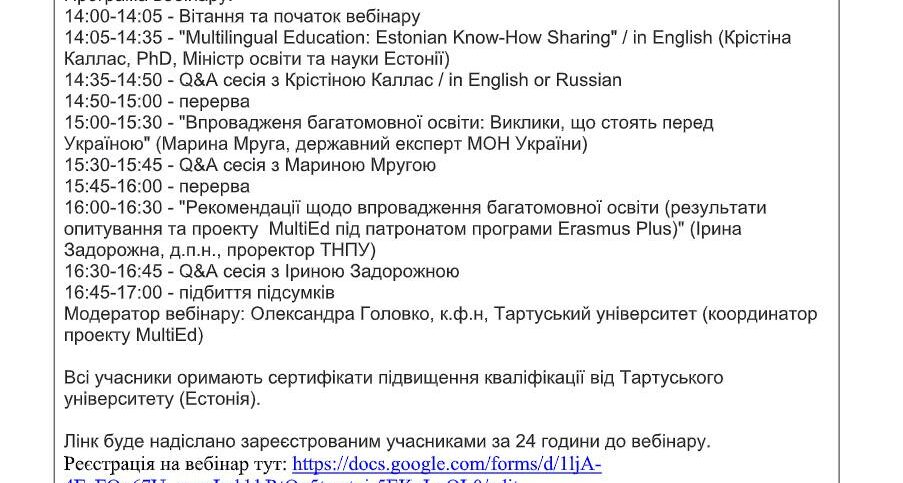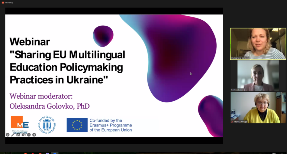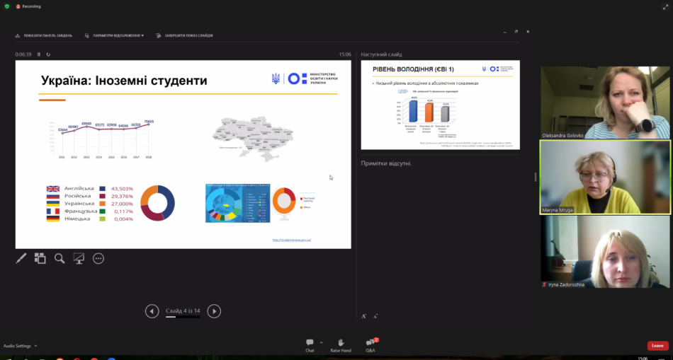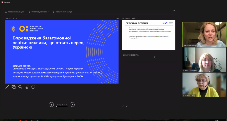 Викладачі факультету взяли участь у міжнародному вебінарі «Sharing EU multilingual education policymaking practices in Ukraine» у рамках реалізації проєкту Erasmus+ KA2 «MultiEd». Модератором заходу виступила координатор проєкту «MultiEd» Олександра Головко (Тартуський університет). Міністр освіти та науки Естонії Крістіна Каллас проаналізувала досвід та підходи Естонії до багатомовної освіти. Державний експерт МОН України Марина Мруга закцентувала увагу на викликах, які стоять перед Україною у процесі впровадження багатомовної освіти. Проректор з наукової роботи та міжнародного співробітництва Тернопільського національного педагогічного університету імені Володимира Гнатюка Ірина Задорожна висвітлила результати дослідження мовної ситуації в університетах України у 2020-2021 рр. Вона поінформувала про досвід упровадження нових курсів, створених із застосуванням європейського досвіду, а також результати використання електронного курсу «Методологія CLIL» на платформі «Moodle», що сприяє підвищенню кваліфікації вчителів та впровадженню CLIL-методології в освітній процес. На вебінарі також обговорювались основні положення Національних рекомендацій із розвитку багатомовної вищої освіти в Україні.