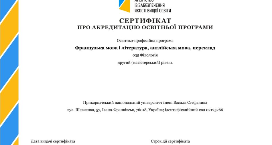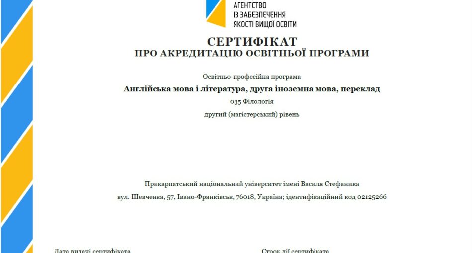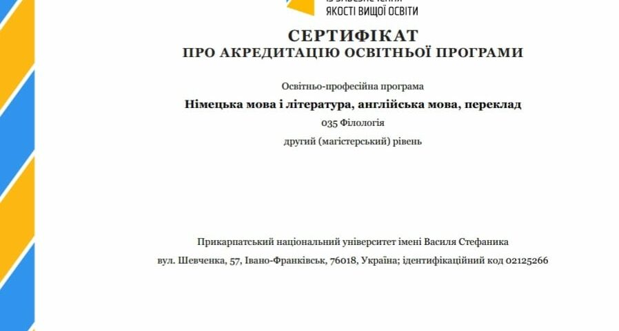 Освітньо-професійні програми факультету другого (магістерського) рівня «Англійська мова і література, друга іноземна мова (німецька, французька, іспанська, китайська на вибір), переклад», “Німецька мова і література, англійська мова, переклад”, “Французька мова і література, англійська мова, переклад” акредитовано до 2029 року Національним агентством із забезпечення якості вищої освіти.