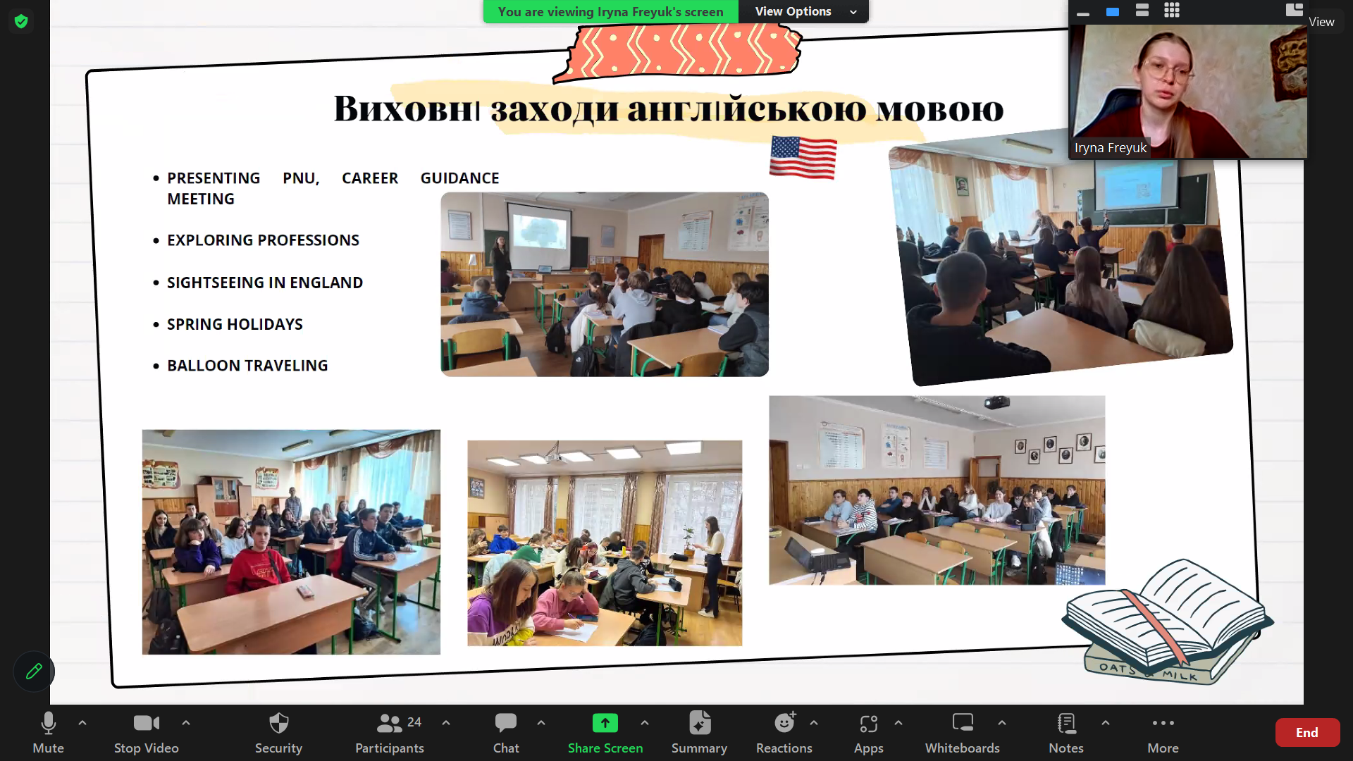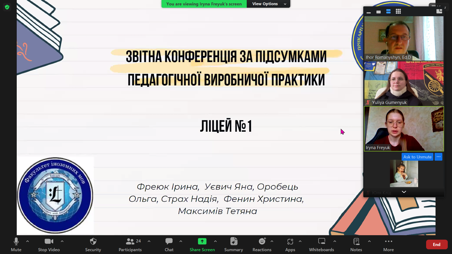 25 квітня 2024 року відбулася підсумкова конференція за результатами виробничої педагогічної практики студентів 4-го курсу спеціальності 014 Середня освіта. Мова і література (англійська) факультету іноземних мов. Практика була організована та проведена відповідно до наказу ректора університету та навчального плану і тривала 4 тижні в закладах загальної середньої освіти міста Івано-Франківська – ліцеях № 1, 19, 22 і 25.