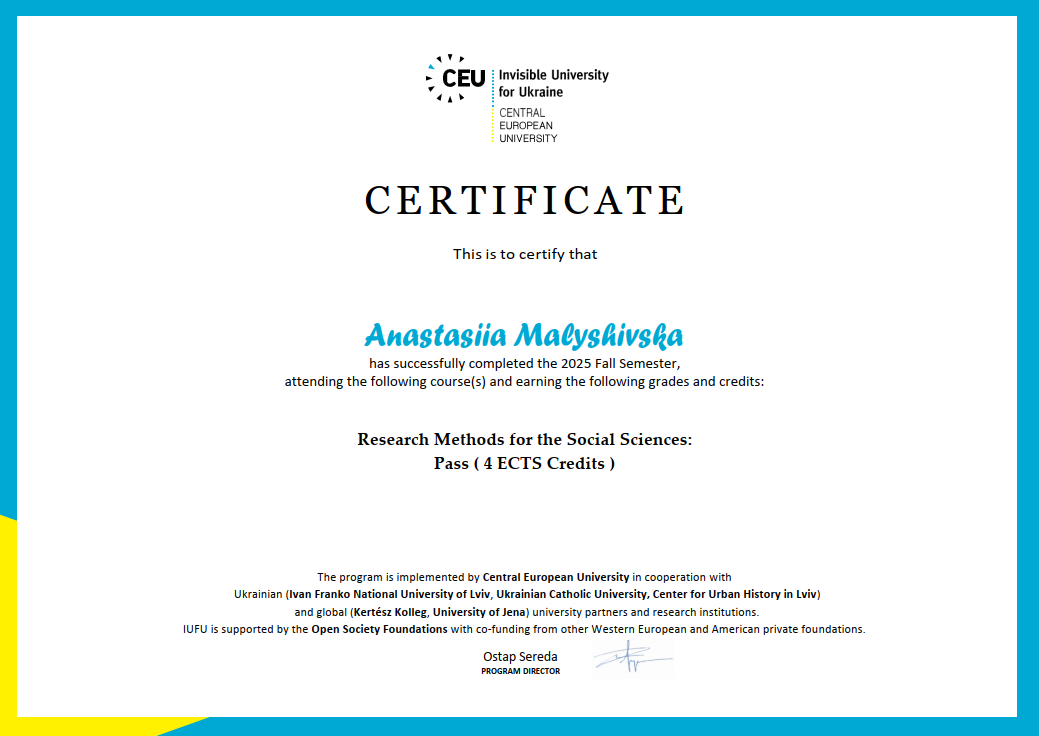 Студентка 2 курсу спеціальності «Англійська мова і література та друга іноземна» Анастасія Малишівська успішно завершила міжнародні курси “Feminisms and Women’s Rights in Eastern and Central Europe” та “Research Methods for the Social Sciences”, організовані в межах програми The Invisible University for Ukraine (IUFU).