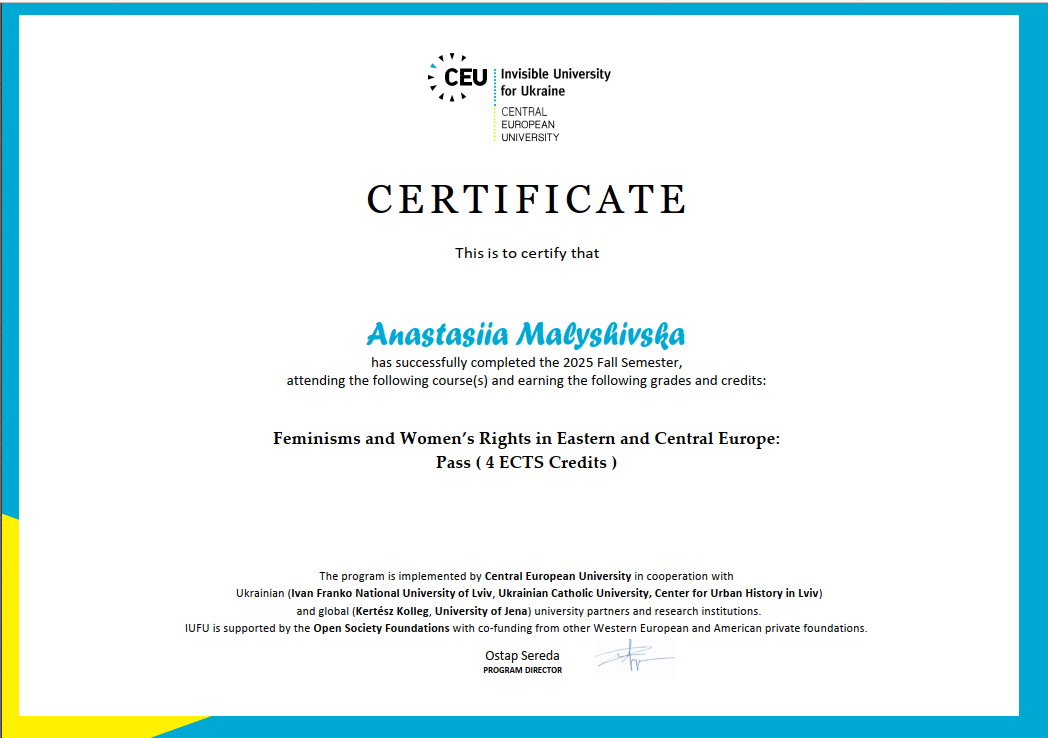 Студентка 2 курсу спеціальності «Англійська мова і література та друга іноземна» Анастасія Малишівська успішно завершила міжнародні курси “Feminisms and Women’s Rights in Eastern and Central Europe” та “Research Methods for the Social Sciences”, організовані в межах програми The Invisible University for Ukraine (IUFU).